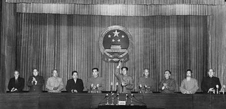 随着国家大规模经济建设的开始,加强国家政治、法律上层建筑领域的建设,更好地为建立社会主义经济基础服务,成为重大而迫切的任务。为此,毛泽东以很大的精力亲自主持了新中国第一部宪法的起草工作。1954年9月,第一届全国人民代表大会第一次会议在北京举行。大会选举毛泽东为中华人民共和国主席,朱德为副主席;选举刘少奇为全国人民代表大会常务委员会委员长,宋庆龄等13人为副委员长;决定周恩来为国务院总理。全国人民代表大会的召开,标志着人民代表大会制度的确立。它与中国共产党领导的多党合作和政治协商、民族区域自治的基本政治制度,构成了我国社会主义的政治制度体系,为我国确立社会主义经济基础和相应的经济制度,提供了政治保障。