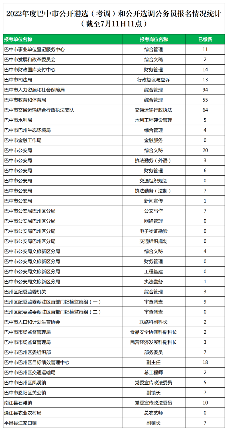 2022年度巴中市公开遴选(考调)和公开选调公务员报名情况统计(截至7月11日11点)