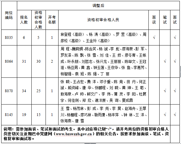 5月21日,中共巴中市委组织部、中共巴中市委人才办在巴中党建网(www.bzswzzb.gov.cn)发布了《四川省巴中市2018年公开引进人才笔试公告》。5月22—23日接受考生咨询期间,有个别考生分别向市、区县委人才办提出资格复核申请,经认真审查复核,现对以下岗位“开考名额”“资格初审合格人员”等内容调整补充公告如下,并以调整后的内容为准。