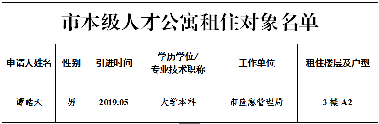 根据《巴中市市本级人才公寓租住管理暂行办法》(巴人才办发〔2018〕24号)文件规定,经本人申请、单位推荐、市住建局审核、市委人才办审批,现对人才公寓拟租住对象谭皓天进行公示。