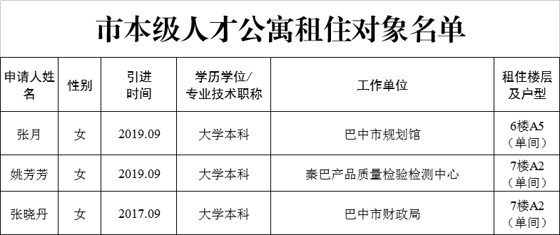 根据 《 巴中市 市 本级 人才公寓 租住 管理暂行办法》( 巴 人才办发〔2018〕 24 号) 规定 ,经 本人 申请、单位 推荐 、 市住建局审核 、 市人才办 审批 ,现 对 人才公寓 拟租住 对象 张月、姚芳芳、张晓丹 进行 公示。