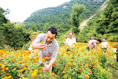 南江县杨坝镇田垭村第一书记带领村民采摘成熟的万寿菊。