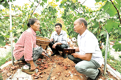 通江县大力实施党员精准扶贫示范项目,党员干部帮助群众抢摘葡萄。