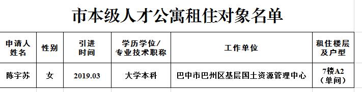根据《巴中市市本级人才公寓租住管理暂行办法》(巴人才办发〔2018〕24号)规定,经本人申请、单位推荐、市住建局审核、市人才办审批,现对人才公寓拟租住对象陈宇苏进行公示。