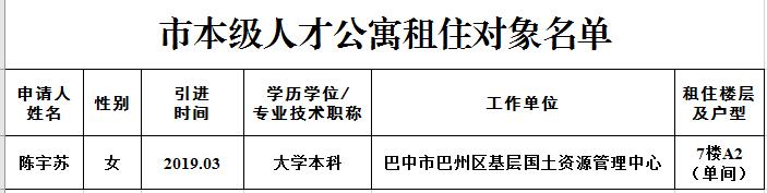 根据《巴中市市本级人才公寓租住管理暂行办法》(巴人才办发〔2018〕24号)规定,经本人申请、单位推荐、市住建局审核、市人才办审批,现对人才公寓拟租住对象陈宇苏进行公示。
