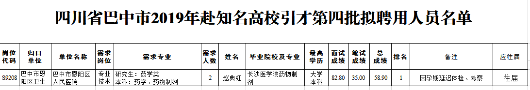 根据《四川省巴中市2019年赴知名高校引才公告》,经网络和现场报名、资格审查、考试考核、体检、考察等程序,现对第四批考察结论为“合格”的拟聘用人员赵典红即日起进行公示。