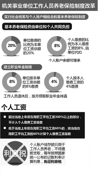 以公务员小张为例,除去津贴、补贴等,每个月缴费工资是5000元,改革前单位和个人都不用缴费,小张退休后照样有养老金。改革后,小张个人每月要缴纳养老保险400元,缴纳职业年金200元,共计600元,这笔钱是从小张的月收入中扣除的,将进入小张的养老金个人账户。连同单位缴费部分,退休后按月发放。