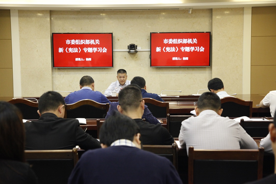 会前,邀请市人大法工委主任杨刚就新《宪法》作辅导讲座,分别从为何要进行宪法修改、修改的有关条款及学习宪法应该形成和增强的意识进行深入浅出的讲解,进一步增强了全体机关干部尊崇宪法、学习宪法、维护宪法、执行宪法的意识和能力。
