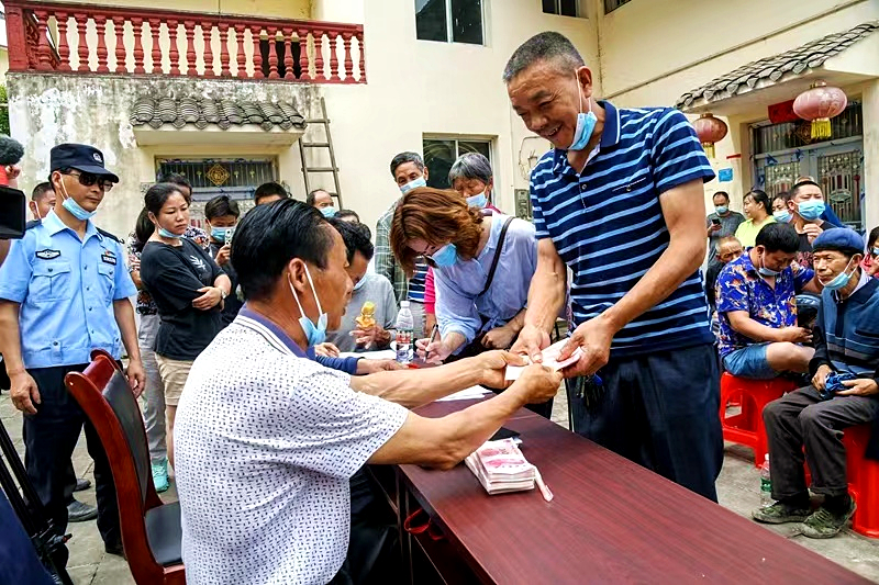“蒲平坚,七个人,每人100元,分红700元……”6月2日上午,通江县三溪镇桅杆坪村村委会人头攒动,一年中最令人期待的集体经济分红大会召开。