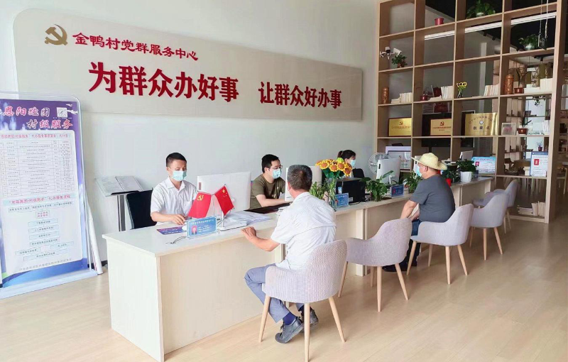 走进兴隆镇金鸭村便民服务大厅,首先映入眼帘的就是“让群众好办事,为群众办好事”几个大字,旁边墙上的“恩阳跑团,为您服务”流程图也显得格外醒目。
